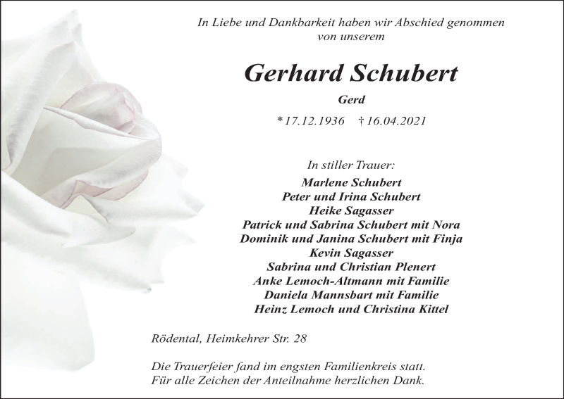 Hier finden Sie alle Traueranzeigen aus der Zeitung, die bisher für Gerhard Schubert erschienen sind. Weitere Traueranzeigen, die in der Zeitung erscheinen, werden hier ebenfalls aufgelistet