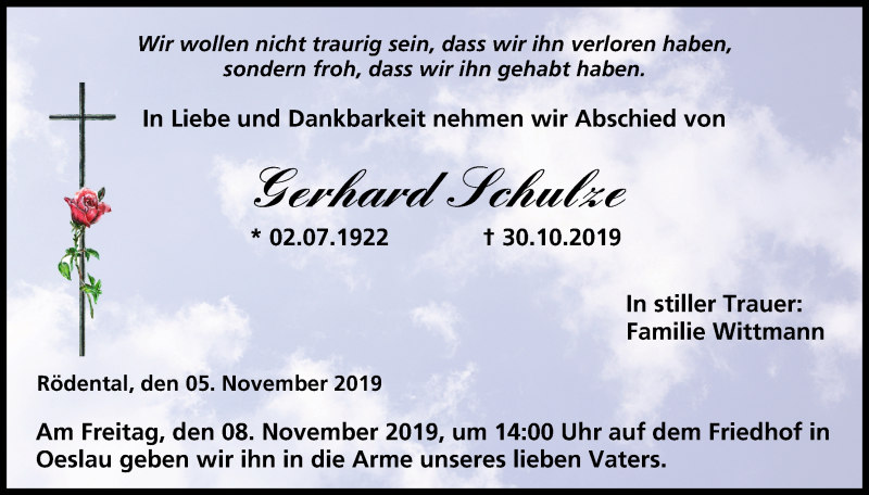 Hier finden Sie alle Traueranzeigen aus der Zeitung, die bisher für Gerhard Schulze erschienen sind. Weitere Traueranzeigen, die in der Zeitung erscheinen, werden hier ebenfalls aufgelistet