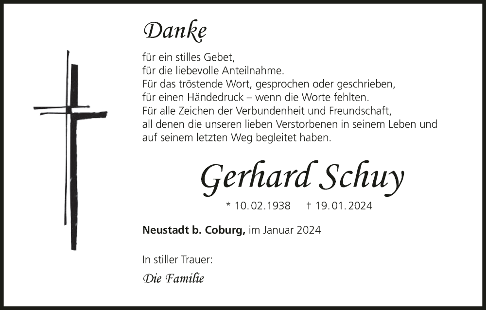 Hier finden Sie alle Traueranzeigen aus der Zeitung, die bisher für Gerhard Schuy erschienen sind. Weitere Traueranzeigen, die in der Zeitung erscheinen, werden hier ebenfalls aufgelistet