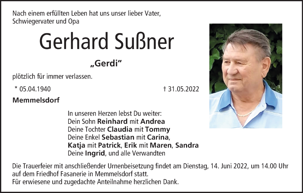 Hier finden Sie alle Traueranzeigen aus der Zeitung, die bisher für Gerhard Sußner erschienen sind. Weitere Traueranzeigen, die in der Zeitung erscheinen, werden hier ebenfalls aufgelistet