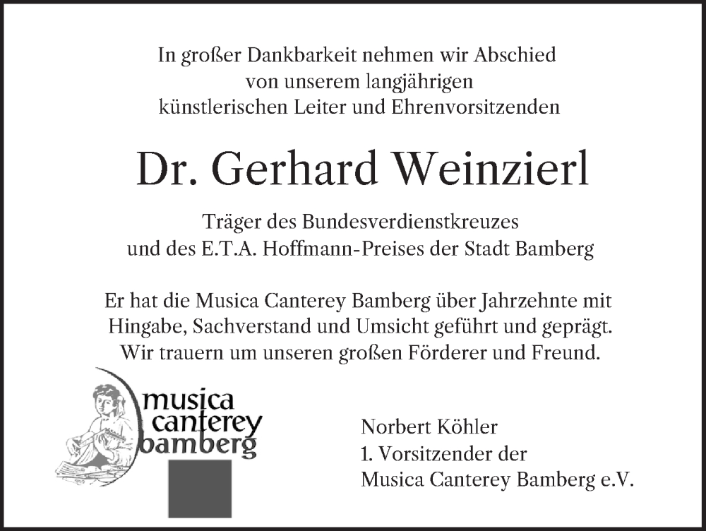 Hier finden Sie alle Traueranzeigen aus der Zeitung, die bisher für Gerhard Weinzierl erschienen sind. Weitere Traueranzeigen, die in der Zeitung erscheinen, werden hier ebenfalls aufgelistet