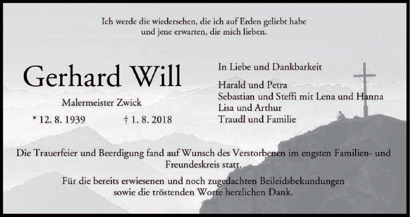 Hier finden Sie alle Traueranzeigen aus der Zeitung, die bisher für Gerhard Will erschienen sind. Weitere Traueranzeigen, die in der Zeitung erscheinen, werden hier ebenfalls aufgelistet