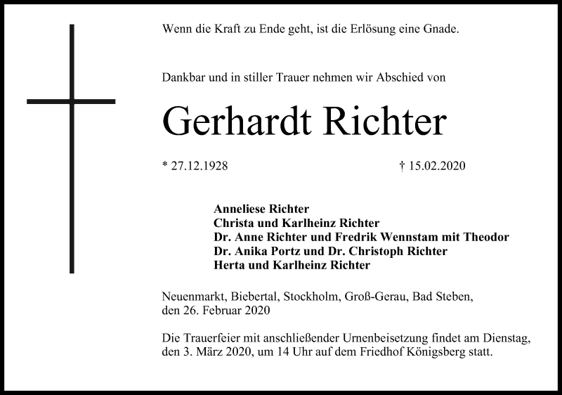 Hier finden Sie alle Traueranzeigen aus der Zeitung, die bisher für Gerhardt Richter erschienen sind. Weitere Traueranzeigen, die in der Zeitung erscheinen, werden hier ebenfalls aufgelistet