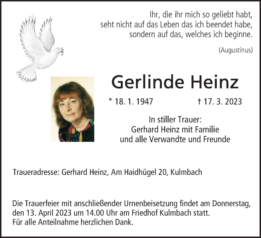 Hier finden Sie alle Traueranzeigen aus der Zeitung, die bisher für Gerlinde Heinz erschienen sind. Weitere Traueranzeigen, die in der Zeitung erscheinen, werden hier ebenfalls aufgelistet