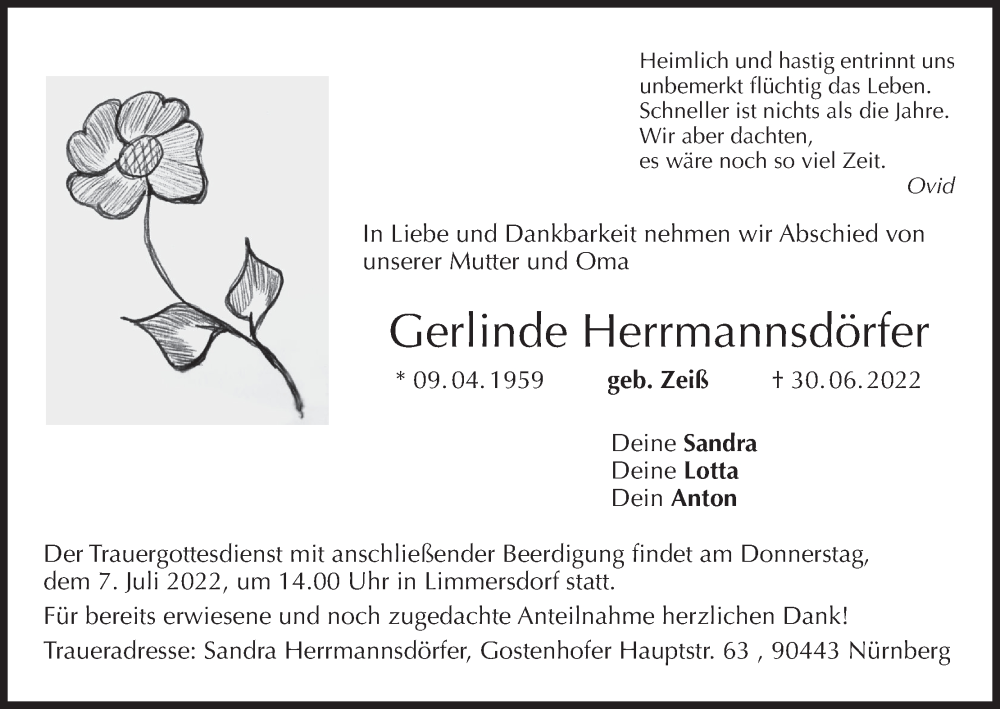 Hier finden Sie alle Traueranzeigen aus der Zeitung, die bisher für Gerlinde Herrmannsdörfer erschienen sind. Weitere Traueranzeigen, die in der Zeitung erscheinen, werden hier ebenfalls aufgelistet