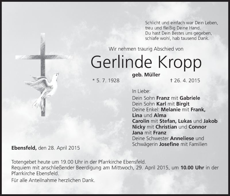 Hier finden Sie alle Traueranzeigen aus der Zeitung, die bisher für Gerlinde Kropp erschienen sind. Weitere Traueranzeigen, die in der Zeitung erscheinen, werden hier ebenfalls aufgelistet