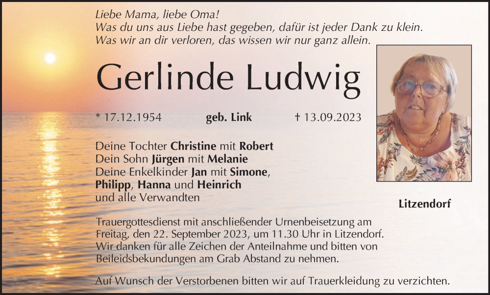 Hier finden Sie alle Traueranzeigen aus der Zeitung, die bisher für Gerlinde Ludwig erschienen sind. Weitere Traueranzeigen, die in der Zeitung erscheinen, werden hier ebenfalls aufgelistet