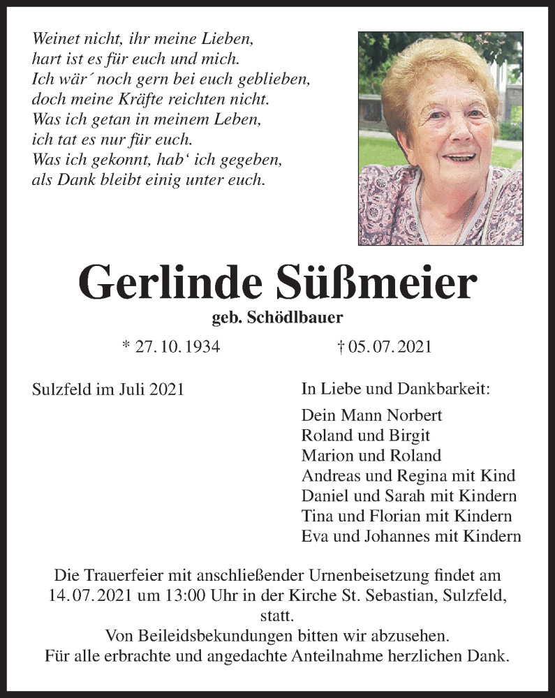 Hier finden Sie alle Traueranzeigen aus der Zeitung, die bisher für Gerlinde Süßmeier erschienen sind. Weitere Traueranzeigen, die in der Zeitung erscheinen, werden hier ebenfalls aufgelistet