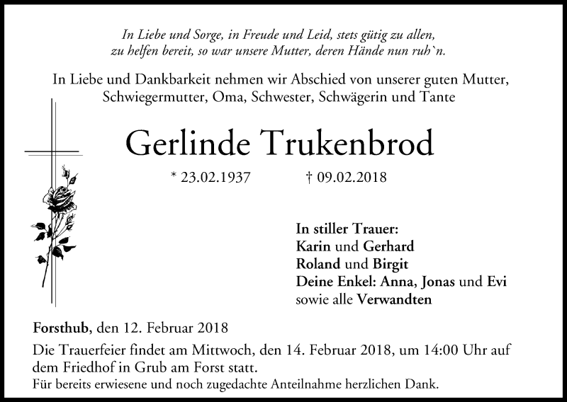 Hier finden Sie alle Traueranzeigen aus der Zeitung, die bisher für Gerlinde Trukenbrod erschienen sind. Weitere Traueranzeigen, die in der Zeitung erscheinen, werden hier ebenfalls aufgelistet