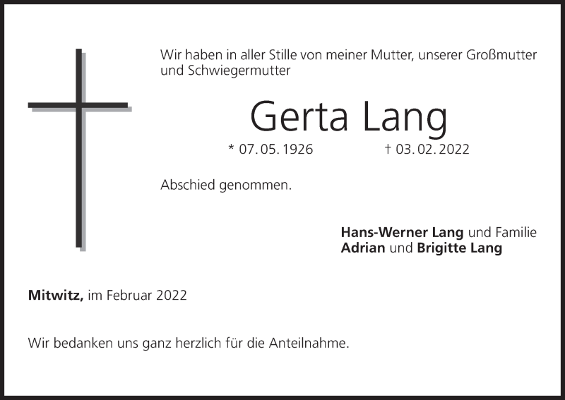 Hier finden Sie alle Traueranzeigen aus der Zeitung, die bisher für Gerta Lang erschienen sind. Weitere Traueranzeigen, die in der Zeitung erscheinen, werden hier ebenfalls aufgelistet