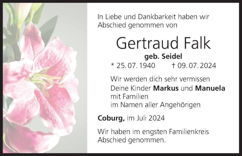 Hier finden Sie alle Traueranzeigen aus der Zeitung, die bisher für Gertraud Falk erschienen sind. Weitere Traueranzeigen, die in der Zeitung erscheinen, werden hier ebenfalls aufgelistet