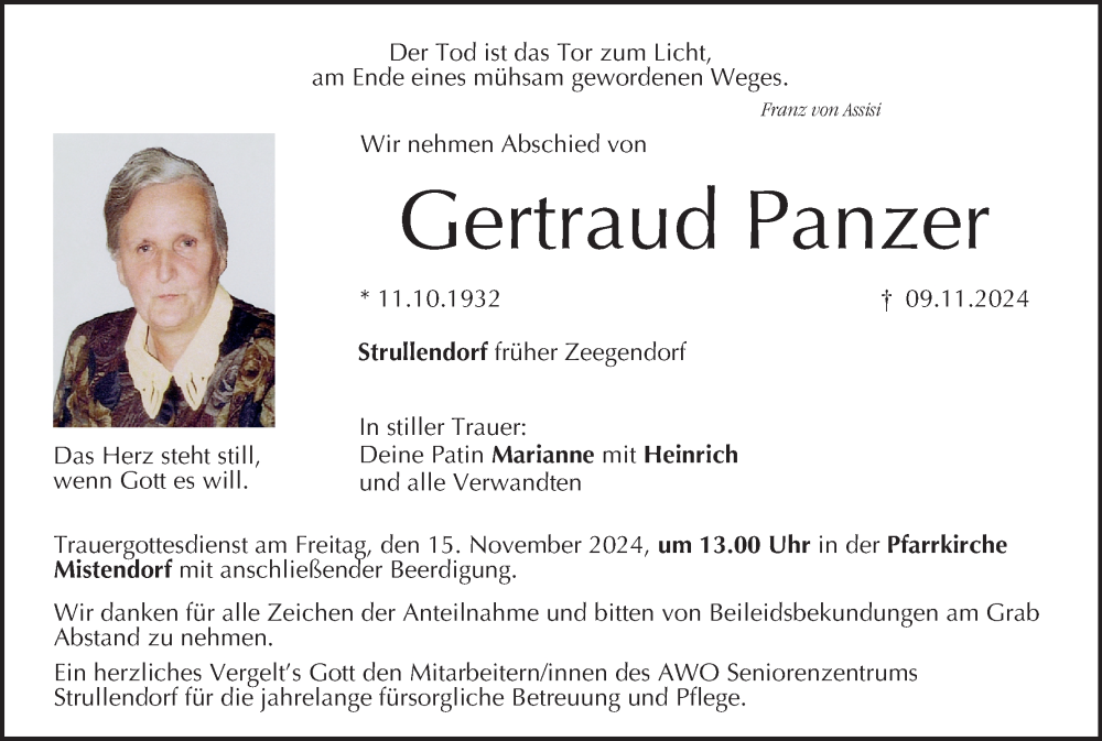 Hier finden Sie alle Traueranzeigen aus der Zeitung, die bisher für Gertraud Panzer erschienen sind. Weitere Traueranzeigen, die in der Zeitung erscheinen, werden hier ebenfalls aufgelistet