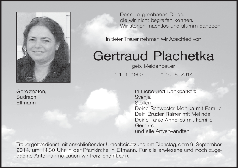 Hier finden Sie alle Traueranzeigen aus der Zeitung, die bisher für Gertraud Plachetka erschienen sind. Weitere Traueranzeigen, die in der Zeitung erscheinen, werden hier ebenfalls aufgelistet