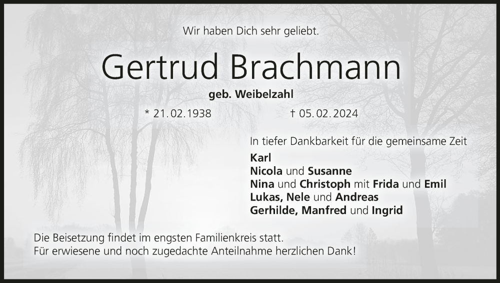 Hier finden Sie alle Traueranzeigen aus der Zeitung, die bisher für Gertrud Brachmann erschienen sind. Weitere Traueranzeigen, die in der Zeitung erscheinen, werden hier ebenfalls aufgelistet