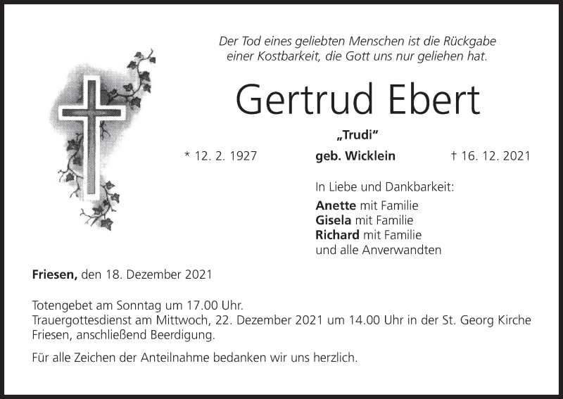 Hier finden Sie alle Traueranzeigen aus der Zeitung, die bisher für Gertrud Ebert erschienen sind. Weitere Traueranzeigen, die in der Zeitung erscheinen, werden hier ebenfalls aufgelistet