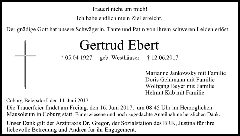 Hier finden Sie alle Traueranzeigen aus der Zeitung, die bisher für Gertrud Ebert erschienen sind. Weitere Traueranzeigen, die in der Zeitung erscheinen, werden hier ebenfalls aufgelistet