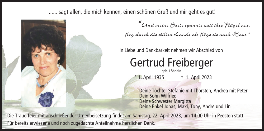 Hier finden Sie alle Traueranzeigen aus der Zeitung, die bisher für Gertrud Freiberger erschienen sind. Weitere Traueranzeigen, die in der Zeitung erscheinen, werden hier ebenfalls aufgelistet