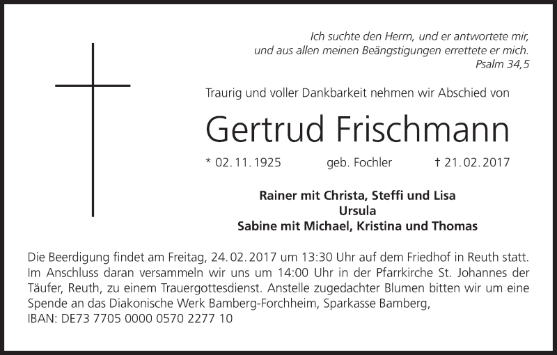 Hier finden Sie alle Traueranzeigen aus der Zeitung, die bisher für Gertrud Frischmann erschienen sind. Weitere Traueranzeigen, die in der Zeitung erscheinen, werden hier ebenfalls aufgelistet