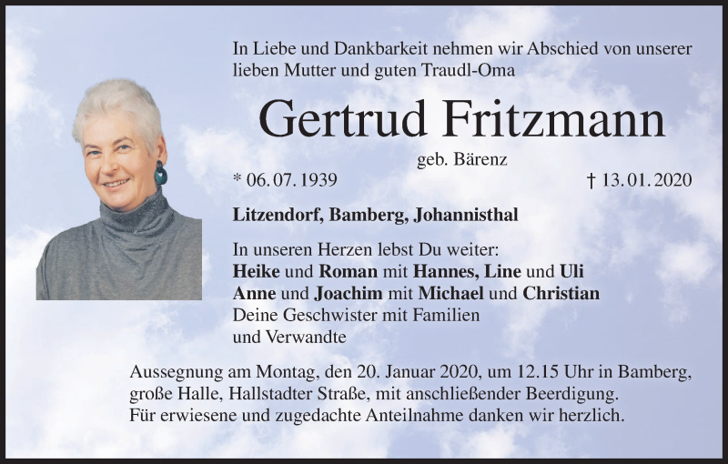 Hier finden Sie alle Traueranzeigen aus der Zeitung, die bisher für Gertrud Fritzmann erschienen sind. Weitere Traueranzeigen, die in der Zeitung erscheinen, werden hier ebenfalls aufgelistet