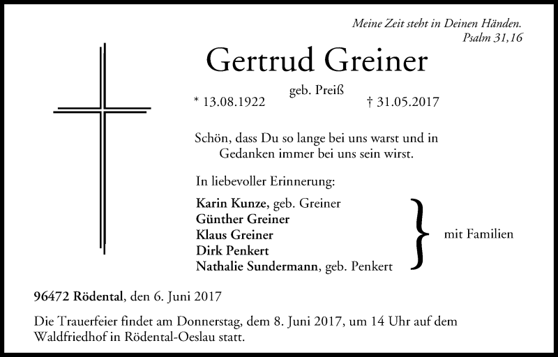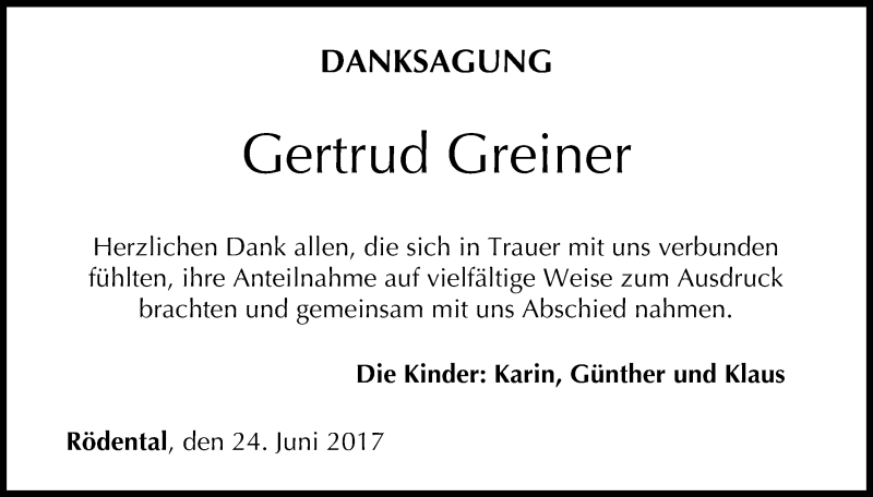 Hier finden Sie alle Traueranzeigen aus der Zeitung, die bisher für Gertrud Greiner erschienen sind. Weitere Traueranzeigen, die in der Zeitung erscheinen, werden hier ebenfalls aufgelistet