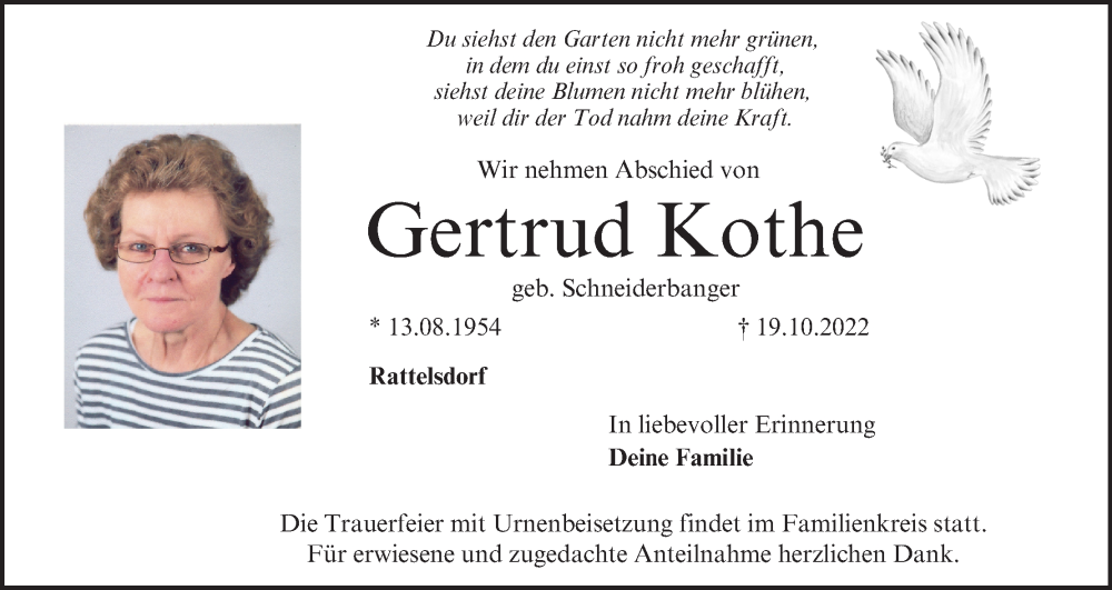 Hier finden Sie alle Traueranzeigen aus der Zeitung, die bisher für Gertrud Kothe erschienen sind. Weitere Traueranzeigen, die in der Zeitung erscheinen, werden hier ebenfalls aufgelistet
