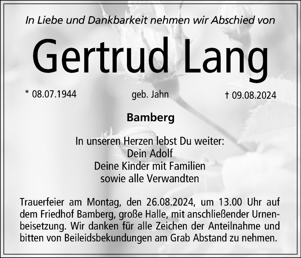 Hier finden Sie alle Traueranzeigen aus der Zeitung, die bisher für Gertrud Lang erschienen sind. Weitere Traueranzeigen, die in der Zeitung erscheinen, werden hier ebenfalls aufgelistet