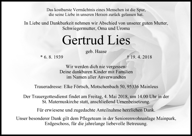 Hier finden Sie alle Traueranzeigen aus der Zeitung, die bisher für Gertrud Lies erschienen sind. Weitere Traueranzeigen, die in der Zeitung erscheinen, werden hier ebenfalls aufgelistet