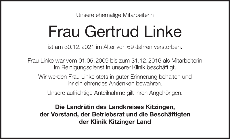 Hier finden Sie alle Traueranzeigen aus der Zeitung, die bisher für Gertrud Linke erschienen sind. Weitere Traueranzeigen, die in der Zeitung erscheinen, werden hier ebenfalls aufgelistet