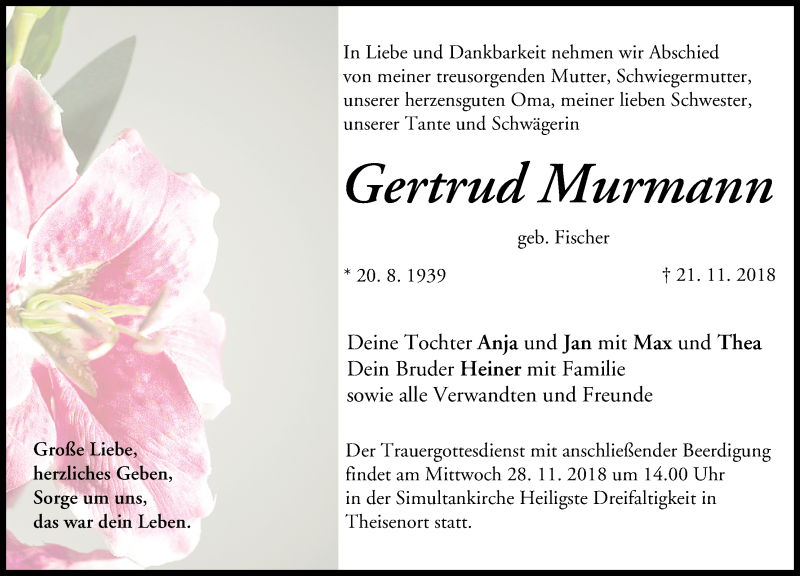 Hier finden Sie alle Traueranzeigen aus der Zeitung, die bisher für Gertrud Murmann erschienen sind. Weitere Traueranzeigen, die in der Zeitung erscheinen, werden hier ebenfalls aufgelistet
