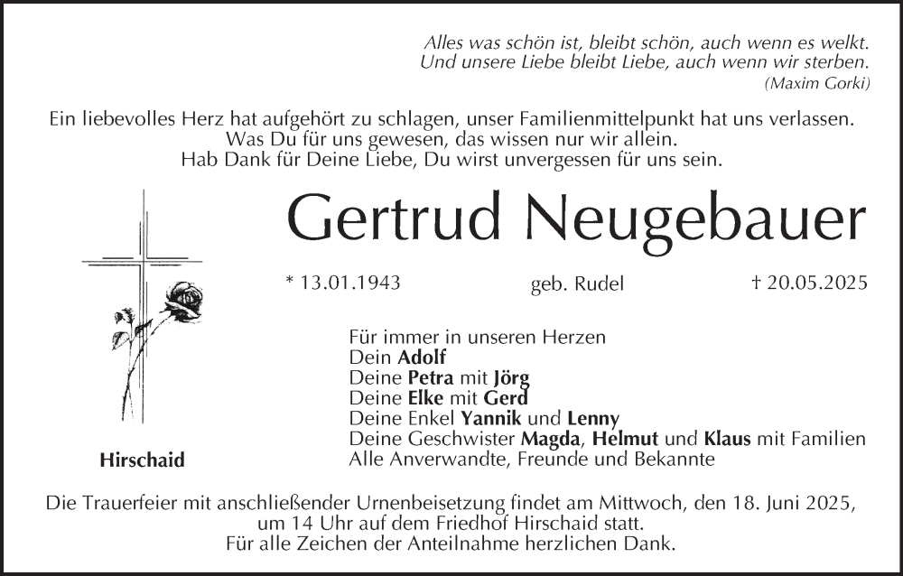 Hier finden Sie alle Traueranzeigen aus der Zeitung, die bisher für Gertrud Neugebauer erschienen sind. Weitere Traueranzeigen, die in der Zeitung erscheinen, werden hier ebenfalls aufgelistet
