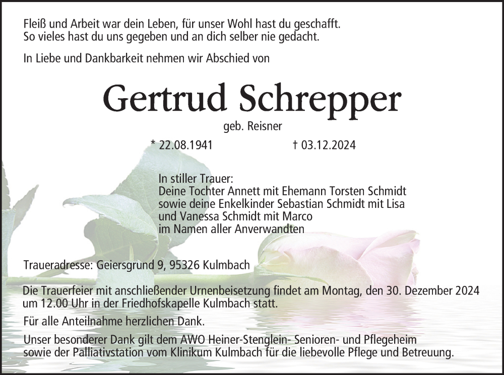 Hier finden Sie alle Traueranzeigen aus der Zeitung, die bisher für Gertrud Schrepper erschienen sind. Weitere Traueranzeigen, die in der Zeitung erscheinen, werden hier ebenfalls aufgelistet