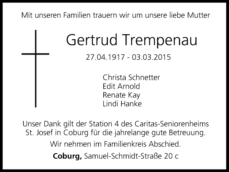Hier finden Sie alle Traueranzeigen aus der Zeitung, die bisher für Gertrud Trempenau erschienen sind. Weitere Traueranzeigen, die in der Zeitung erscheinen, werden hier ebenfalls aufgelistet