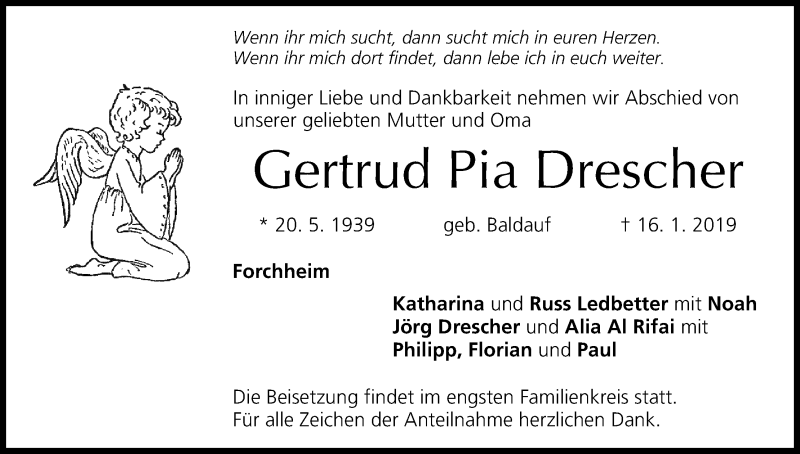 Hier finden Sie alle Traueranzeigen aus der Zeitung, die bisher für Gertrud Pia Drescher erschienen sind. Weitere Traueranzeigen, die in der Zeitung erscheinen, werden hier ebenfalls aufgelistet
