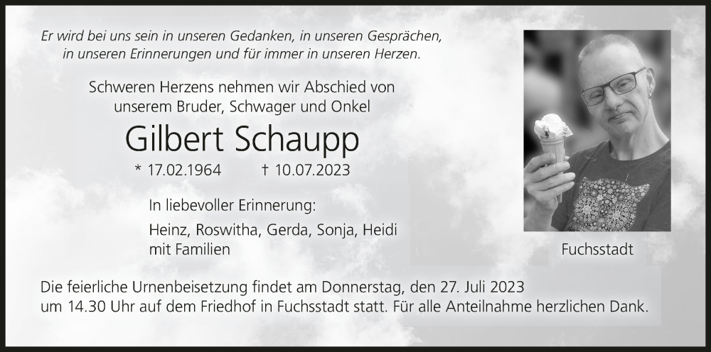 Hier finden Sie alle Traueranzeigen aus der Zeitung, die bisher für Gilbert Schaupp erschienen sind. Weitere Traueranzeigen, die in der Zeitung erscheinen, werden hier ebenfalls aufgelistet