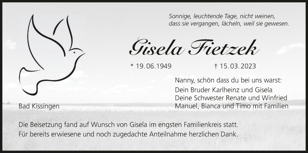 Hier finden Sie alle Traueranzeigen aus der Zeitung, die bisher für Gisela Fitzek erschienen sind. Weitere Traueranzeigen, die in der Zeitung erscheinen, werden hier ebenfalls aufgelistet