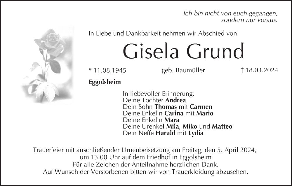 Hier finden Sie alle Traueranzeigen aus der Zeitung, die bisher für Gisela Grund erschienen sind. Weitere Traueranzeigen, die in der Zeitung erscheinen, werden hier ebenfalls aufgelistet
