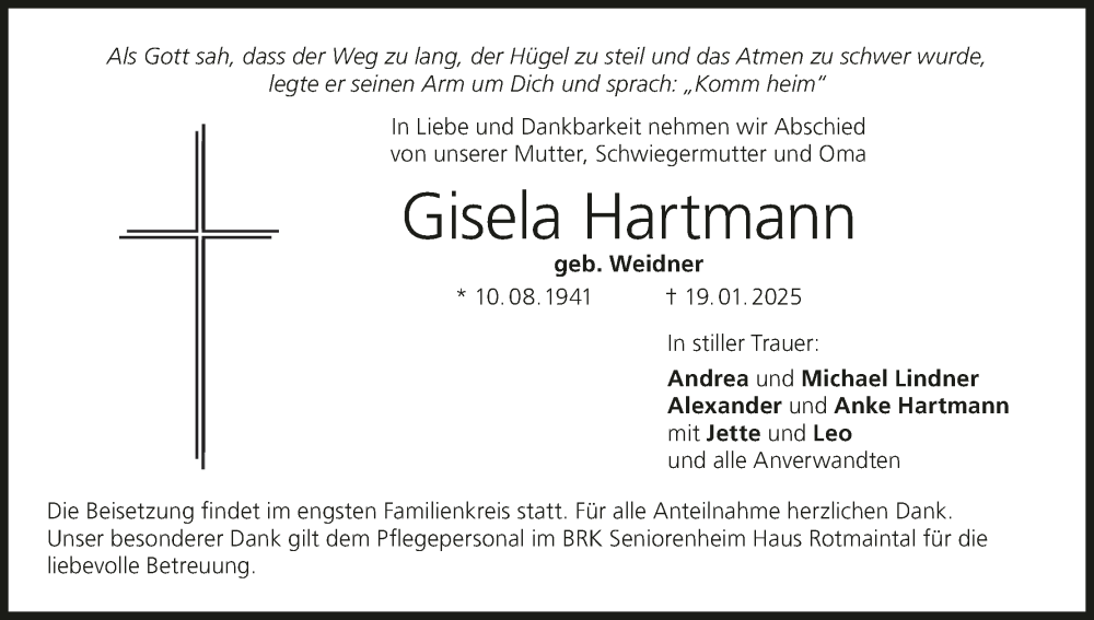 Hier finden Sie alle Traueranzeigen aus der Zeitung, die bisher für Gisela Hartmann erschienen sind. Weitere Traueranzeigen, die in der Zeitung erscheinen, werden hier ebenfalls aufgelistet