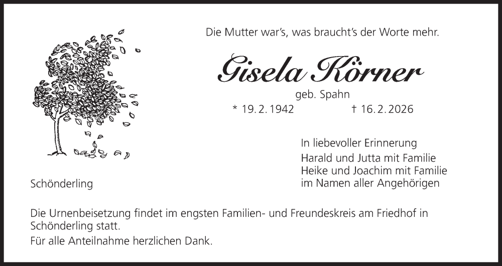 Hier finden Sie alle Traueranzeigen aus der Zeitung, die bisher für Gisela Körner erschienen sind. Weitere Traueranzeigen, die in der Zeitung erscheinen, werden hier ebenfalls aufgelistet