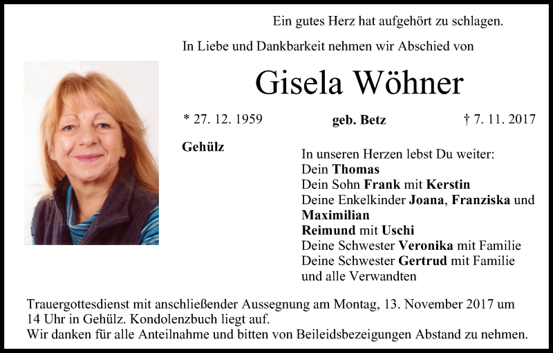 Hier finden Sie alle Traueranzeigen aus der Zeitung, die bisher für Gisela Wöhner erschienen sind. Weitere Traueranzeigen, die in der Zeitung erscheinen, werden hier ebenfalls aufgelistet