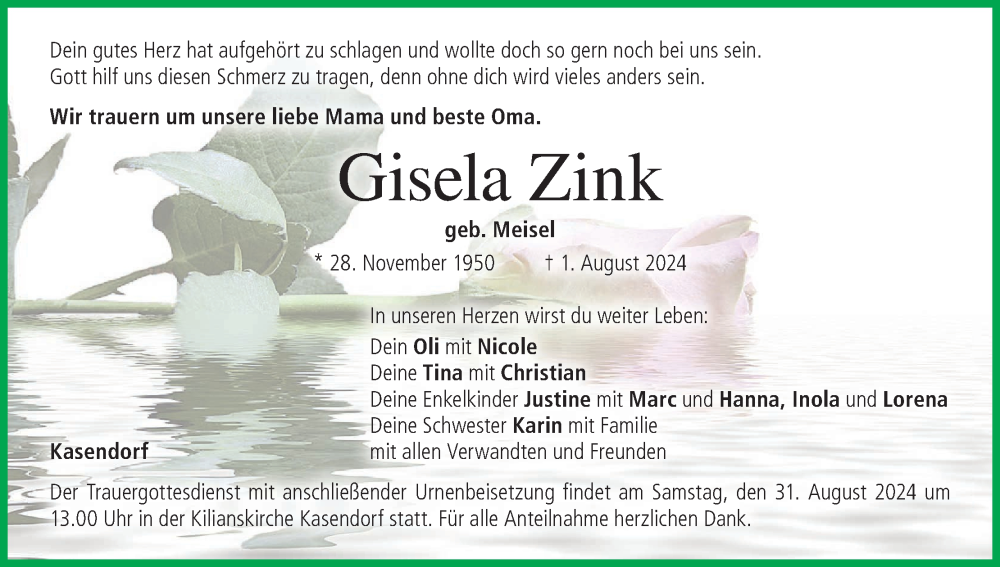 Hier finden Sie alle Traueranzeigen aus der Zeitung, die bisher für Gisela Zink erschienen sind. Weitere Traueranzeigen, die in der Zeitung erscheinen, werden hier ebenfalls aufgelistet