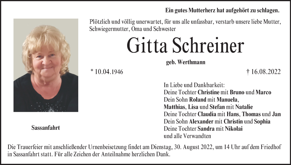 Hier finden Sie alle Traueranzeigen aus der Zeitung, die bisher für Gitta Schreiner erschienen sind. Weitere Traueranzeigen, die in der Zeitung erscheinen, werden hier ebenfalls aufgelistet