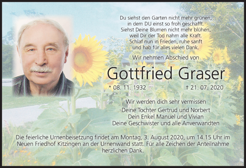 Hier finden Sie alle Traueranzeigen aus der Zeitung, die bisher für Gottfried Graser erschienen sind. Weitere Traueranzeigen, die in der Zeitung erscheinen, werden hier ebenfalls aufgelistet