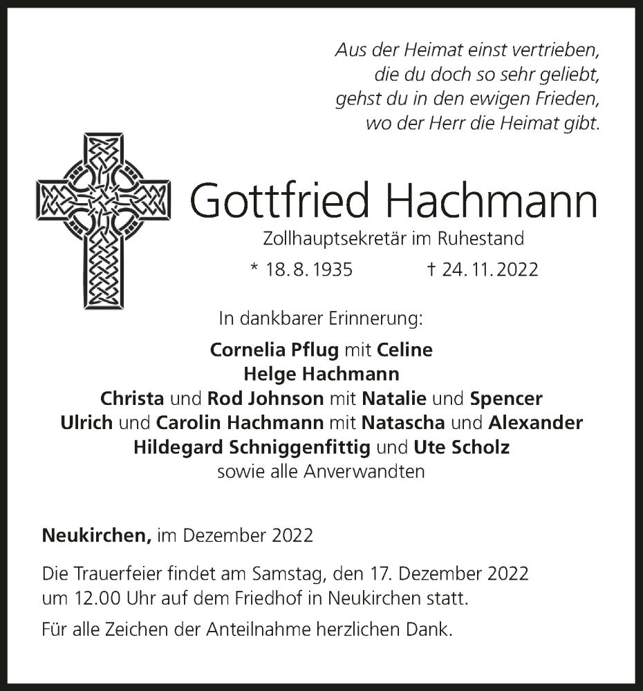 Hier finden Sie alle Traueranzeigen aus der Zeitung, die bisher für Gottfried Hachmann erschienen sind. Weitere Traueranzeigen, die in der Zeitung erscheinen, werden hier ebenfalls aufgelistet