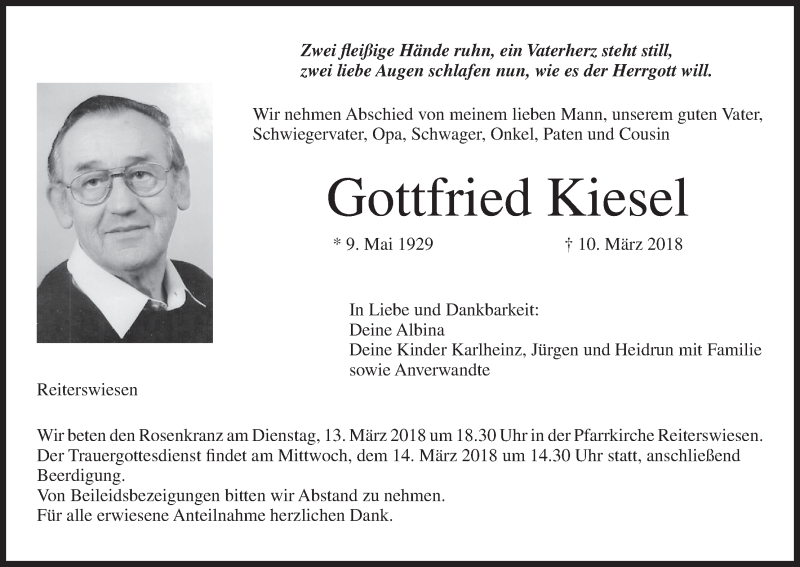 Hier finden Sie alle Traueranzeigen aus der Zeitung, die bisher für Gottfried Kiesel erschienen sind. Weitere Traueranzeigen, die in der Zeitung erscheinen, werden hier ebenfalls aufgelistet
