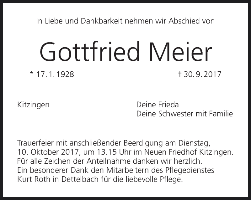 Hier finden Sie alle Traueranzeigen aus der Zeitung, die bisher für Gottfried Meier erschienen sind. Weitere Traueranzeigen, die in der Zeitung erscheinen, werden hier ebenfalls aufgelistet