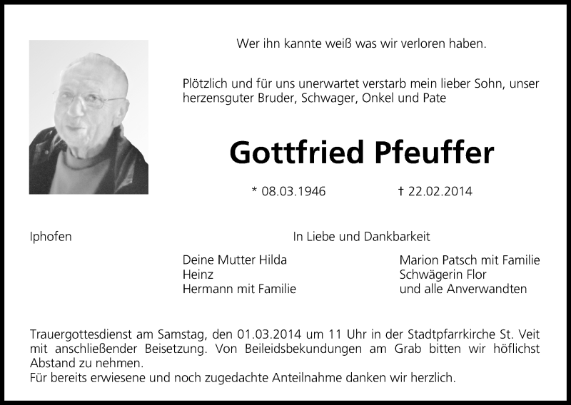 Hier finden Sie alle Traueranzeigen aus der Zeitung, die bisher für Gottfried Pfeuffer erschienen sind. Weitere Traueranzeigen, die in der Zeitung erscheinen, werden hier ebenfalls aufgelistet