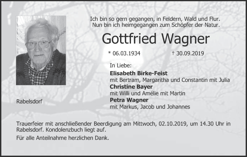 Hier finden Sie alle Traueranzeigen aus der Zeitung, die bisher für Gottfried Wagner erschienen sind. Weitere Traueranzeigen, die in der Zeitung erscheinen, werden hier ebenfalls aufgelistet