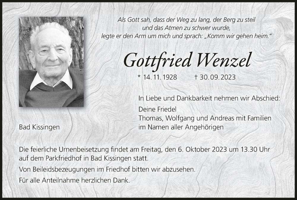 Hier finden Sie alle Traueranzeigen aus der Zeitung, die bisher für Gottfried Wenzel erschienen sind. Weitere Traueranzeigen, die in der Zeitung erscheinen, werden hier ebenfalls aufgelistet