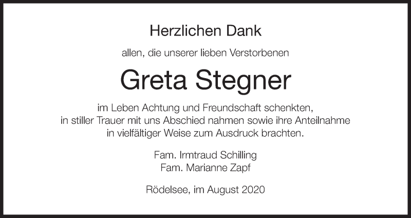 Hier finden Sie alle Traueranzeigen aus der Zeitung, die bisher für Greta Stegner erschienen sind. Weitere Traueranzeigen, die in der Zeitung erscheinen, werden hier ebenfalls aufgelistet