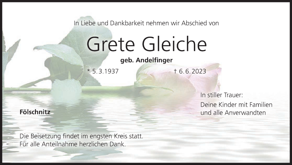 Hier finden Sie alle Traueranzeigen aus der Zeitung, die bisher für Grete Gleiche erschienen sind. Weitere Traueranzeigen, die in der Zeitung erscheinen, werden hier ebenfalls aufgelistet
